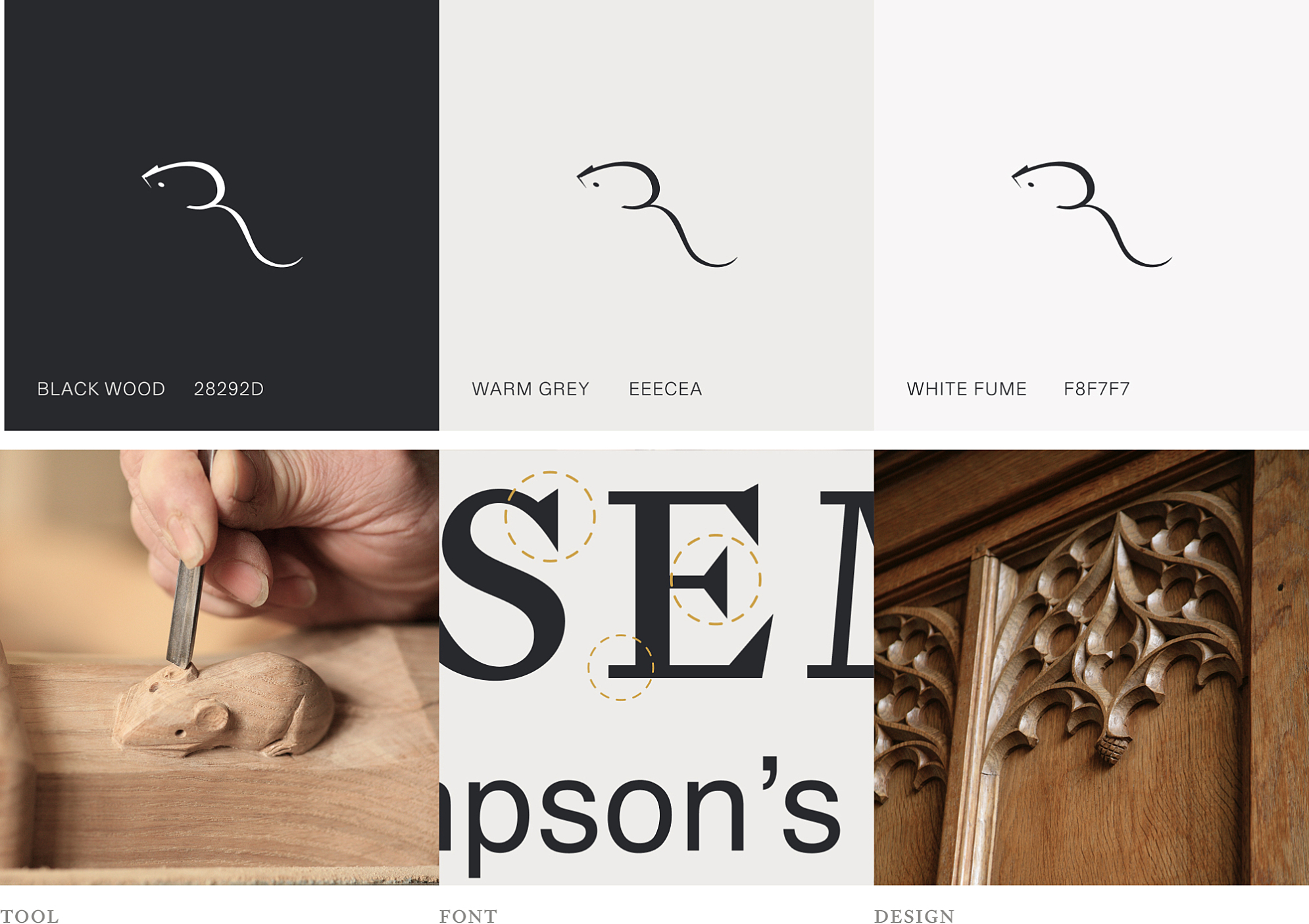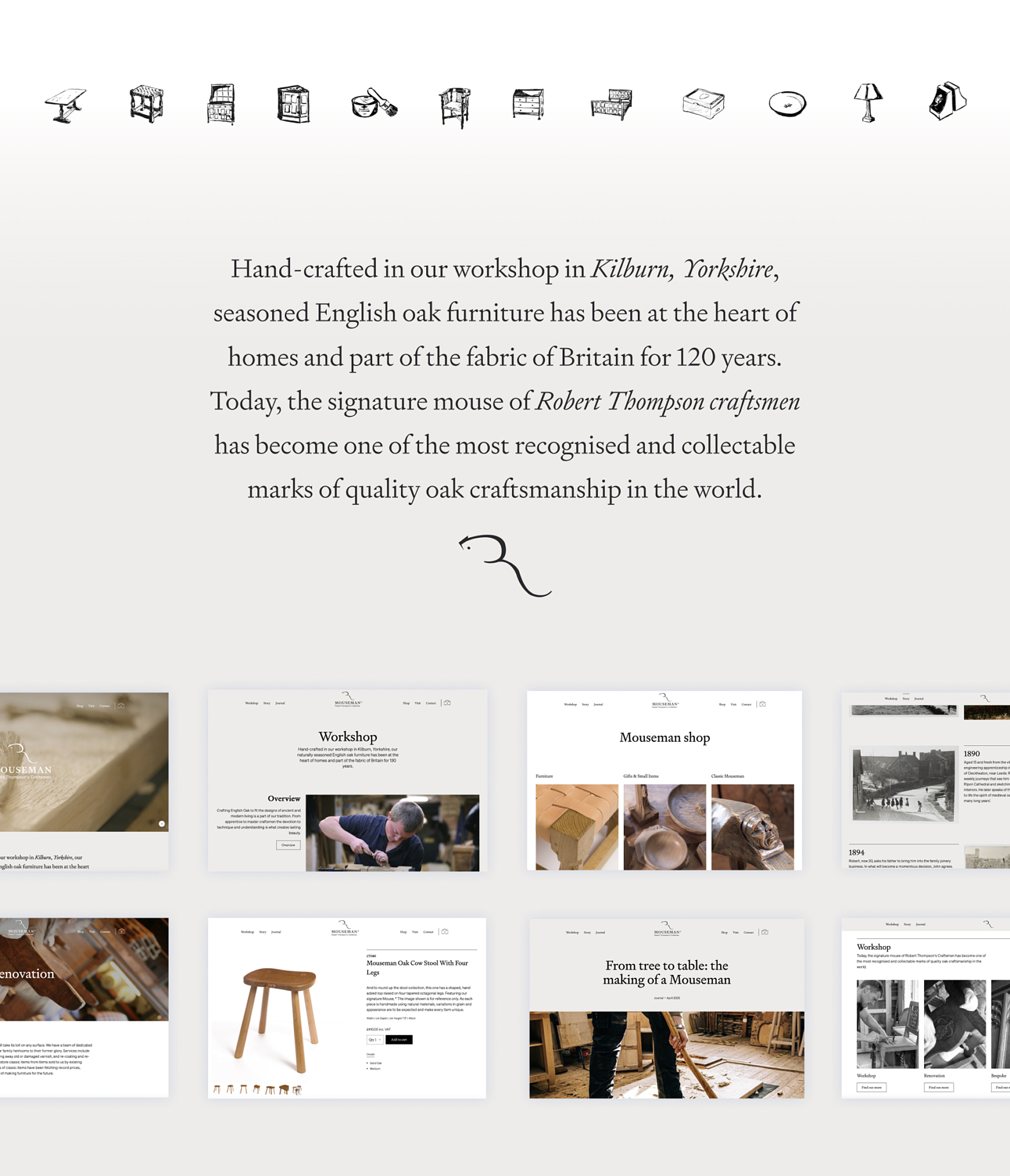 We explored a new visual identity and evolved their logo, maintaining the beautiful mouse icon and giving it space to breathe. We paired it with a font that reminded us of the marks a chisel makes in wood. For the colour, we naturally drew inspiration from oak and its many forms. We also collaborated with the storytellers at Untold Agency, who immersed themselves in the world of Mouseman, developed a film and story as a centerpiece to the new site.